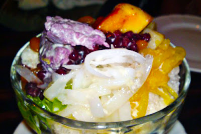 The icy treat is usually topped with leche flan (custard), halaya (purple yam pudding) or ice cream, or a combination of the three.
